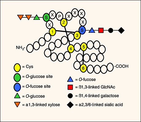 Fig. 3 Many of the EGF-like repeats in the extracellular domain of Notch contain sites for O-fucose and/or O-glucose modifications.