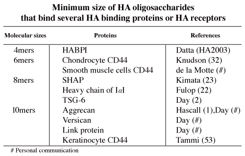 Nowadays, many researchers in HA science use hyaluronan (HA) oligosaccharides to study biological and biochemical processes. One of the early studies was reported in 1974 by Hascall and Heinegård 1. Using biochemical methods, they showed that the minimum size of HA that is able to bind strongly to aggrecan is HA-10 mers, (GlcUA-GlcNAc)5. Many HA binding proteins including HA receptors have been found 2, and it is important to elucidate the minimum sizes of HA that bind to them. HA oligosaccharides have also been used to inhibit binding of the HA binding proteins to endogenous HA 3,4 (de la Motte, personal communication).