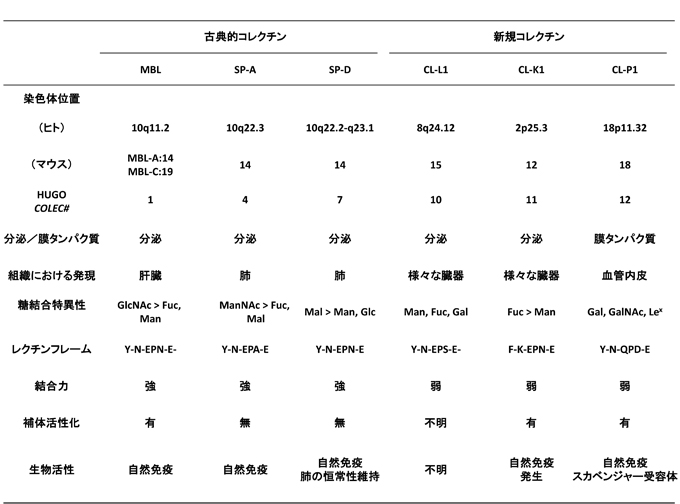 コレクチンは、コラーゲン様構造を分子内部に有するC型レクチンスーパーファミリーの仲間であるが、ヒトではその遺伝子とタンパク質の構造から5つの分泌型コレクチンと1つの膜型コレクチンに分類される1, 2(図1、表1)。