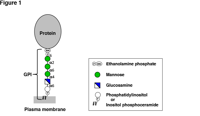 Many eukaryotic cell surface proteins are anchored to the outer leaflet of the plasma membrane by the glycolipid GPI that is covalently attached to the carboxy-terminus (Figure 1). More than 150 kinds of GPI-anchored proteins (GPI-APs) are known to exist in the human body acting as hydrolytic enzymes, receptors, adhesion molecules, complement regulatory proteins and prions1, 2. GPI-APs are particularly abundant in parasitic protozoa, a major form of membrane proteins3. Some protozoa have GPI anchor-like but non-protein-linked glycolipids on their cell surface. Pathogenic and non-pathogenic fungi have many kinds of GPI-APs; for example, about 60 of 6,000 genes of budding yeast Saccharomyces cerevisiae encode GPI-APs. A unique feature of fungal GPI-APs is that some of them are incorporated into the cell wall by a cleavage in the glycan moiety and transglycosylation4.