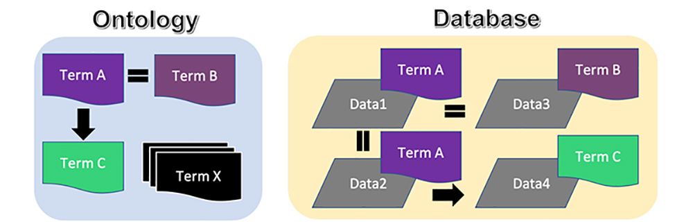 セマンティックウェブ(SemWeb)技術は、標準化した意味をデータとともに格納する強力な方法の1つであり、その生命科学への応用については過去の論文で解説しています7。端的に言うと、SemWebではオントロジーを使用しますが、、これは管理された語彙とそれらの関係性を形式的に定義したものです。よく知られている例としてはジーン・オントロジー(Gene Ontology)8があります。これは、すべての用語に識別子を与え、遺伝子の機能、細胞内での局在、分子の特性などを階層的に定義したものです。そしてSemWebでは、このようなオントロジーに関するターム(term)とともにデータを格納することで、データに意味を付与できるようになっています。図1に、オントロジーとデータベース、そしてこれらの関係性を図示しました。オントロジーは、データに内包される概念を記述するためのタームで構成されています。そして、これらのタームは互いに関係性を持っています。例えばこの図では、Term AとTerm Bは、小さな違いはあるかもしれませんが、同等の概念を表しています。一方でTerm Cは全く別の概念であり、Term A(およびTerm B。Term Aと同等であるため)と何らかの関係を持っています。このようにオントロジーには、タームやそれらの関係性が多数定義されています(図中のTerm X)。次に、この図の右側に示したように、データベースには、はじめはコンピュータで解釈できないデータ(灰色で示したデータ)が含まれています。つまり、データ間に何の関係性もない状態で別々に格納されています。しかし、このデータには、これらを記述するためのオントロジータームとして、メタデータを付与することができます。図に示したように、Data1とData2はTerm A、Data3はTerm B、そしてData4はTerm Cの概念として定義されています。この追加情報が付与されていることで、オントロジーで定義した関係性を、結果的にデータの中で推測することができるようになります。つまり、Data1とData2(全く同じ概念)の関係性や、Data3とのつながり(Data1およびData2と同等)、さらにはData4が他の3つのデータすべてと何らかの形で関係していることを、人間とコンピュータの両方が推測できるのです(黒矢印および等号)。