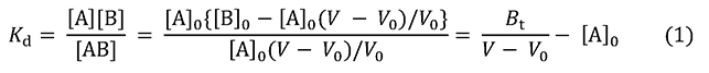 This equation indicates that the delay in elution is inversely proportional to Kd (proportional to association constant Ka), and its proportionality constant is Bt. Further, here we substitute [B]0V0 for Bt and divide both sides by V0. When the concentration of the analyte is extremely low, most immobilized ligands are not bound to analytes, and thus [B]0 can be assumed to be [B], and equation 7 is obtained.