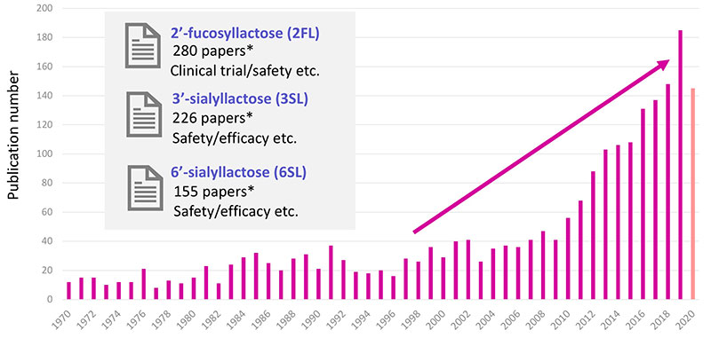 The number of articles has been increasing remarkably since 2010, which suggests that the supply of a large number of HMOs samples has enabled researchers to conduct more functional studies (Fig. 8). There are a lot of articles on 2’-FL already. We believe that it’s because the concentration of 2’-FL is high, and commercial products have become widely available. In parallel, the number of publications on other HMOs like 3’-SL and 6’-SL is increasing.