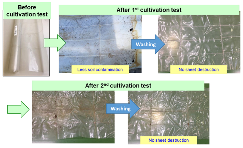Shinshu University, in collaboration with Toyama Kankyo Seibi Co., Ltd. and the Isogai Laboratory at the University of Tokyo, conducted a cultivation experiment using a film farming method for growing tomatoes in a greenhouse setting using CNF/PE composite sheets. Figure 7 shows the appearance of the composite sheets after the test. Commercially available sheets are difficult to use multiple times because they deform or fragment significantly after one use (about half a year), but the durable composite sheets with low water absorption can be used multiple times (4 times, 2 years) without damage. Furthermore, the quality of the tomatoes harvested are equivalent to that of tomatoes harvested from current fields, and the yield is increased by approximately 10%.