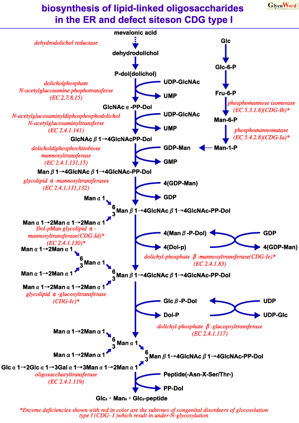 CDGS type I is further classified in to several subtypes by deficient enzymes; phosphomannomutase deficiency (type Ia)(4), which is most frequent, phosphomannose isomerase deficiency (Type Ib)(5), glucosyltransferase deficiency and dehydrodolichol reductase deficiency are reported. In all subtypes of type I, the levels of Glc3Man9GlcNAc2-PP-dolichol decrease, and as a result, the transfer efficiency of oligosaccharides to polypeptides decreases. Further new oligosaccharide transfer deficiencies by defects of the other enzymes might be discovered, because the biosynthetic process of dolichol-linked oligosaccharide intermediate consists of multi-steps. Up to the present, the transfer deficiency of N-linked glycan has been reported on serum glycoproteins such as transferrin and antithrombin III, beta-trace protein from cerebrospinal fluid, and erythrocyte membrane glycoproteins in patients with CDG type I, and such transfer deficiency should occur in most tissues because of its broad clinical symptoms. It has been reported that loss of N-linked sugar chains affects the biological function of glycohormones, cell-surface expression of receptors, secretion of glycoproteins and intracellular transport of lysosomal enzymes. Although the symptoms of CDG type I are crucial in early infancy, they gradually improve, and patients even older than 50 years of age are reported. No definitive treatment is currently available for CDG. However, oral supplementation with mannose improved the biochemical abnormalities in the deficiency of phosphomannose isomerase (CDG Type Ib) so that symptoms were relatively slight.