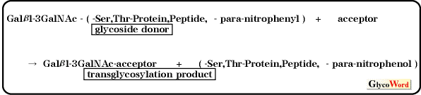 As these endo- -GalNAc-ases liberate O-linked oligosaccharide from cell surface glycoproteins without causing damage to cells, they are useful for the investigation of the structure and function of O-linked oligosaccharides on the cell surface. Endo- -GalNAc-ase from Diplococcus pneumoniae (endo- -GalNAc-ase-D) and from Alcaligenes sp. (endo- -GalNAc-ase-A) have frequently been used as an important reagent in studies on the structure and physiological role of O-linked oligosaccharides. The endo-GalNAc-ases from Diplococcus pneumoniae and Bacillus sp. show transglycosylation activity and can transfer the oligosaccharides (Gal 1-3GalNAc) from glycoside donor to various acceptors, such as monosaccharides, disaccharides, sugar alcohols, Tris, glycerol, p-nitrophenol, threonine and serine, during hydrolysis of the glycoside donor.