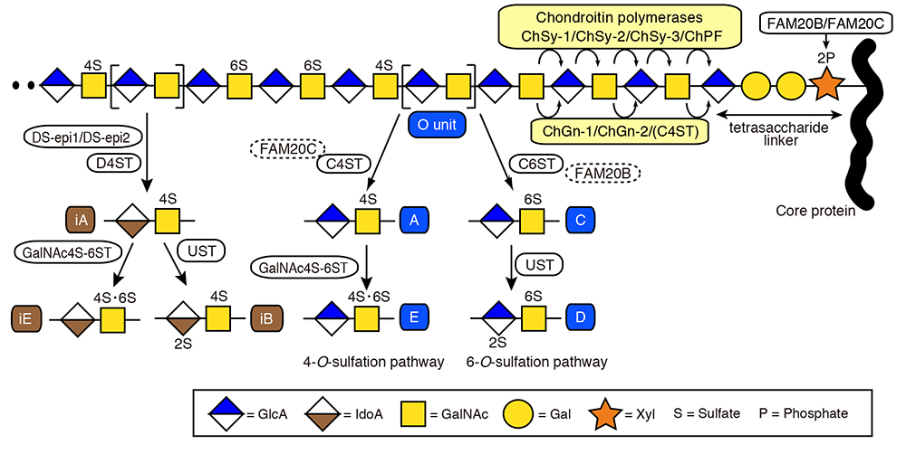 Chondroitin sulfate (CS) and dermatan sulfate (DS) chains are representative sulfated glycosaminoglycan (GAG) polysaccharides that are expressed as proteoglycans (PGs), where at least one GAG chain is covalently linked to various protein cores. CSPGs and DSPGs are ubiquitously distributed on cell surfaces and within extra/pericellular matrices, which provide functional microenvironments to regulate diverse cellular processes. These divergent functions of CSPGs and DSPGs are exerted largely through their GAG moieties with structural heterogeneity, which are created by collaborative and/or competitive actions of anabolic enzymes for CS/DS biosynthesis (1, 2). CS backbone consists of a simple, linear polysaccharide, chondroitin (Chn), comprising repeating disaccharide units of glucuronic acid (GlcA) and N-acetylgalactosamine (GalNAc). DS corresponds to a stereoisomer for CS, with varying proportions of iduronic acid (IdoA) in place of GlcA in species- and tissue-dependent manners. These GAGs often exist as CS/DS hybrid chains (1).